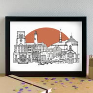 A blank card featuring a pen and ink skyline illustration of some of Hereford's greatest landmarks.