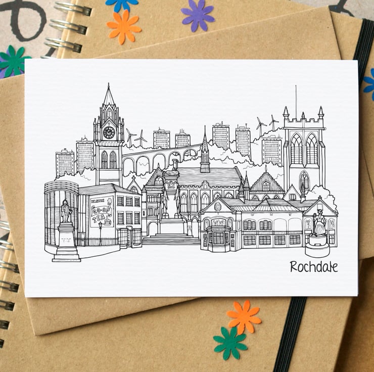 A blank card featuring a skyline illustration of some of Rochdale's greatest landmarks.