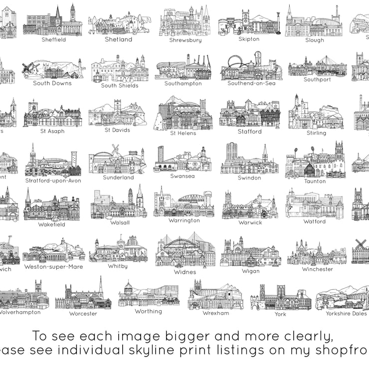 For more information about each of the illustrations (and the landmarks featured in the image) please check the individual listings for the co-ordinating prints.