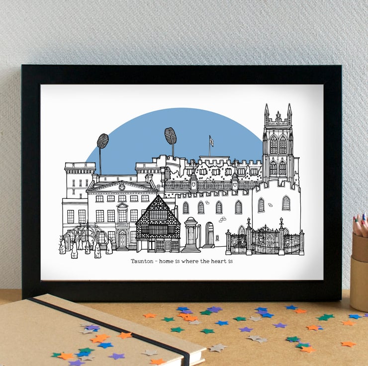 A pretty skyline print of my illustration of the most famous landmarks in Taunton, Somerset.