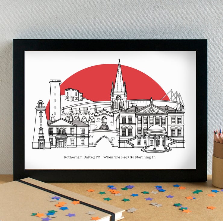 A lovley print of my skyline illustration of the most famous landmarks in Rotherham, including the New York Stadium, homeground to Rotherham United Football Club. The print is completed with a bright Rotherham red "sunshine" background.