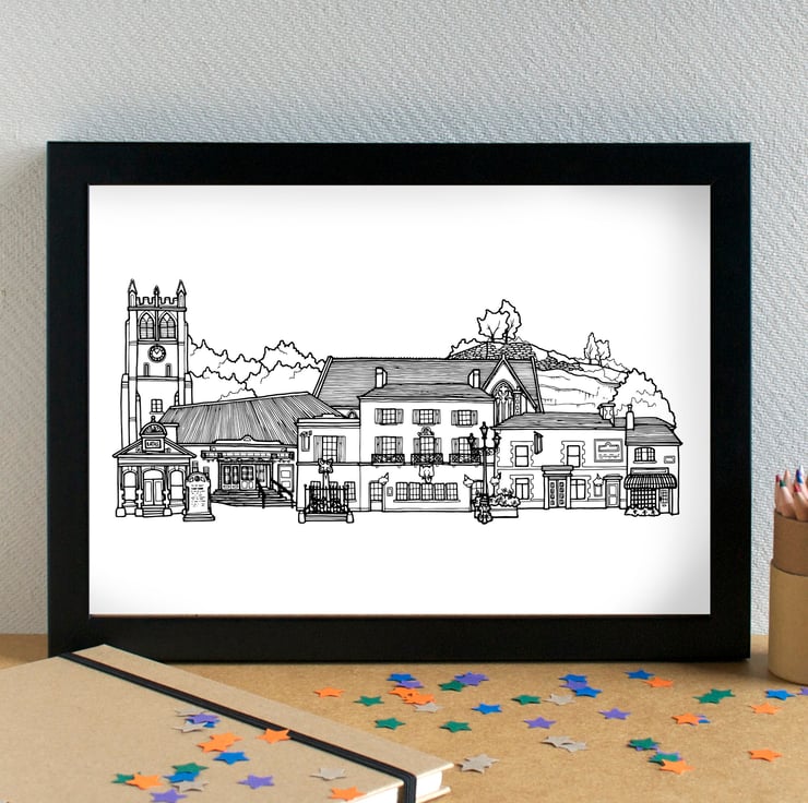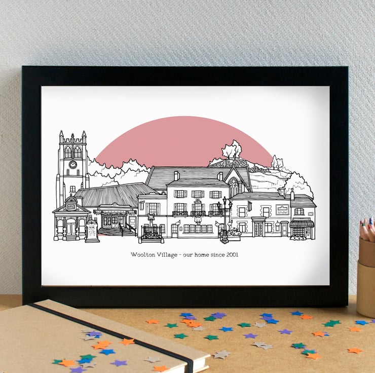 A pretty print of my hand drawn skyline illustration of the most famous landmarks in Woolton Village, Liverpool.