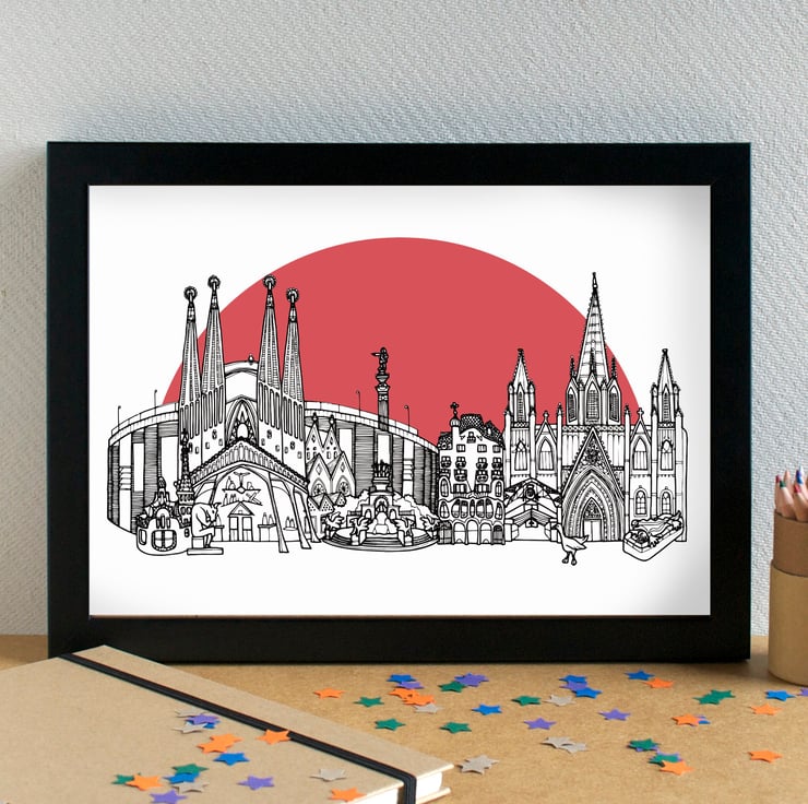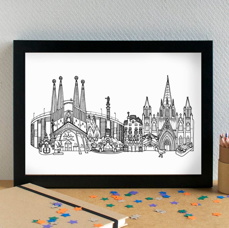 A pretty art print of my skyline illustration of the most famous landmarks in beautiful Barcelona.