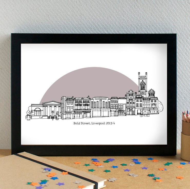 A print of my hand drawn illustration of the most famous contemporary landmarks on Liverpool's famous and much-loved Bold Street.