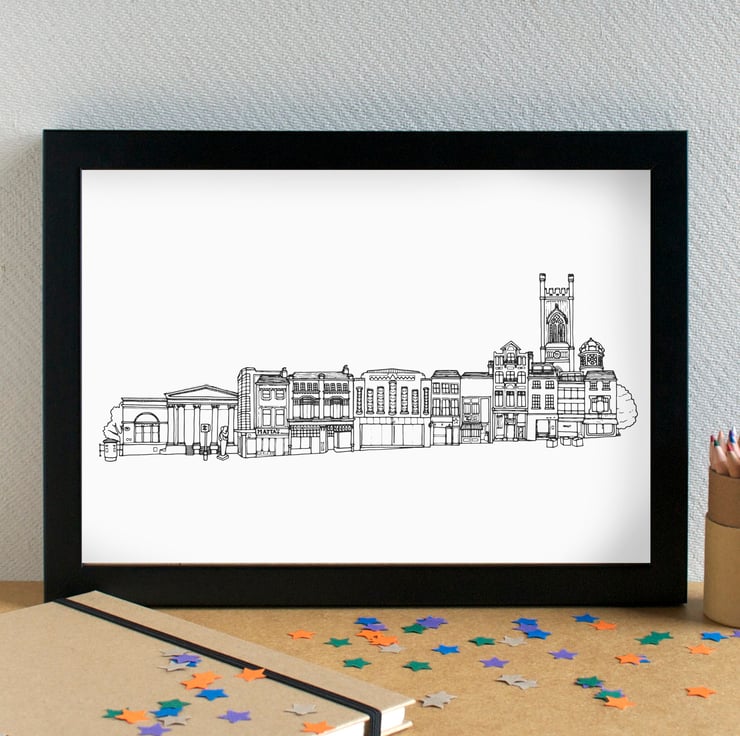 A print of my hand drawn illustration of the most famous contemporary landmarks on Liverpool's famous and much-loved Bold Street.