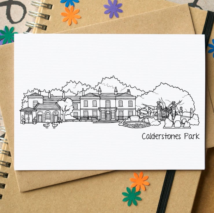 A blank card featuring an illustration of some of the most iconic landmarks in South Liverpool's Calderstones Park.