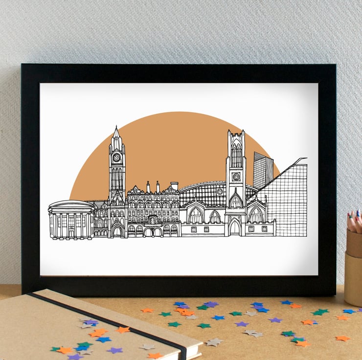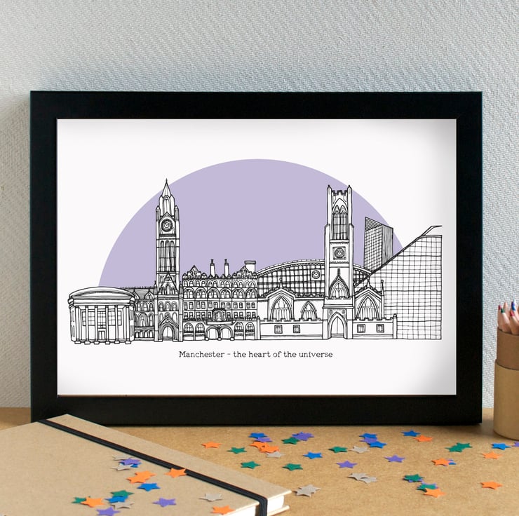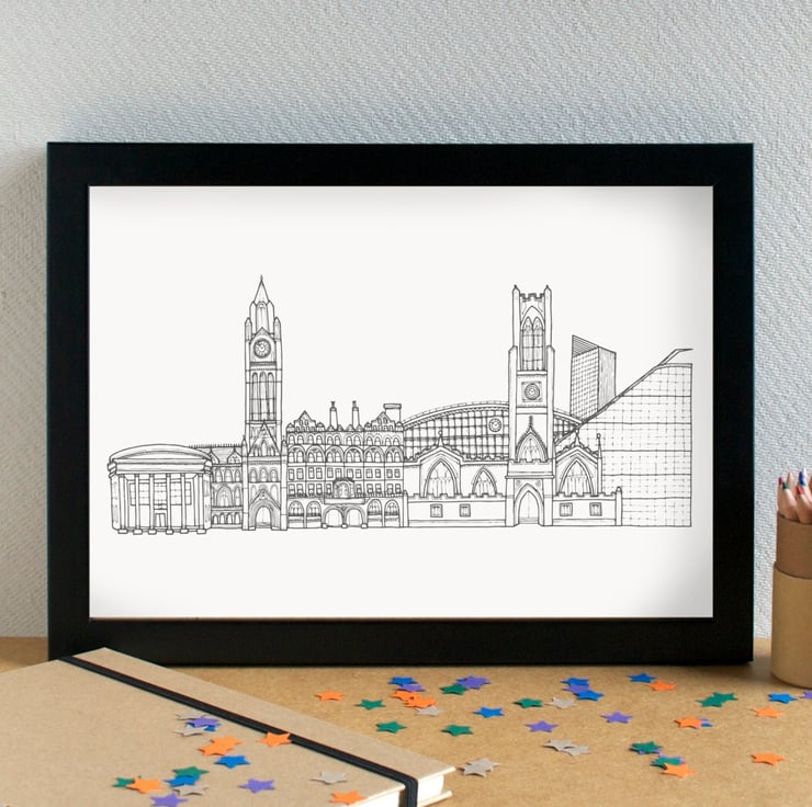 A pretty print of my skyline illustration of the most famous landmarks in Manchester.