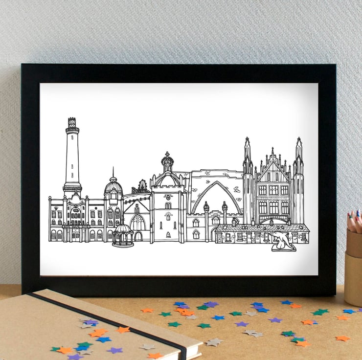 A pretty print of my line-drawn illustration of the most famous landmarks in bonny Aberdeen.