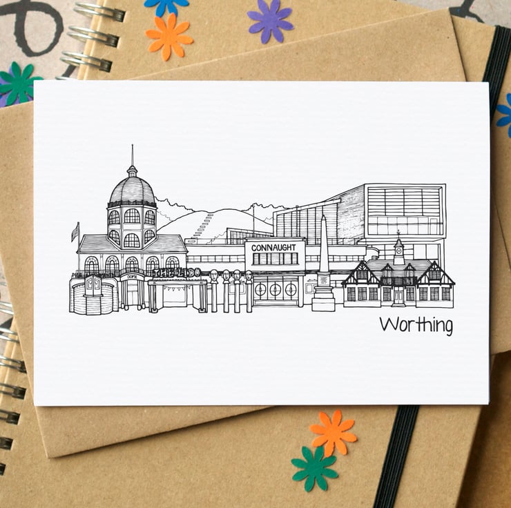 A blank card featuring a skyline illustration of some of Worthing's most memorable landmarks.