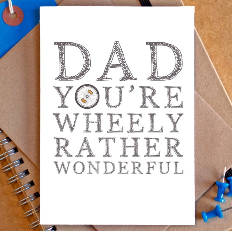 A lovely little card for your Dad, featuring the phrase "Dad You're Wheely Rather Wonderful", and my drawing of a bike wheel.