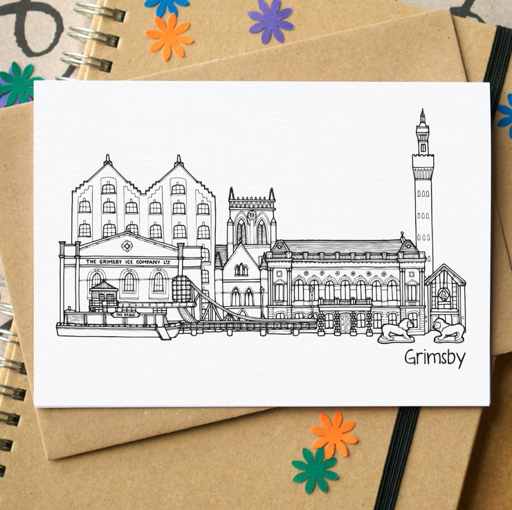 A blank card featuring a skyline illustration of some of Grimsby's greatest landmarks.