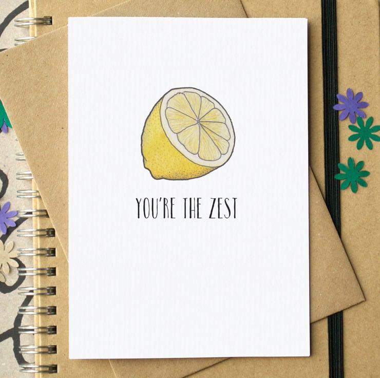 The card features my illustration of a juicy half lemon - which I drew by hand and then coloured with watercolour paint. The phrase "You're The Zest" accompanies the lemon.