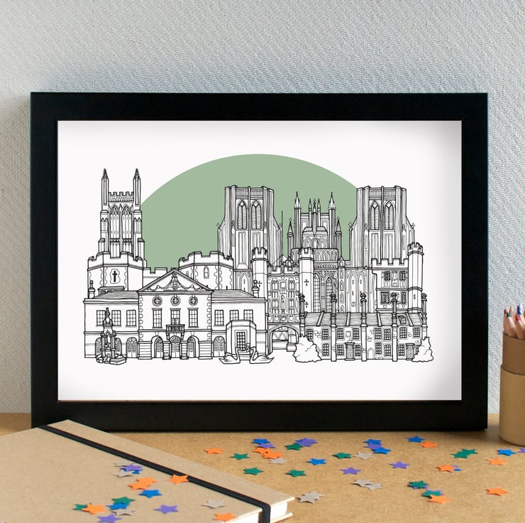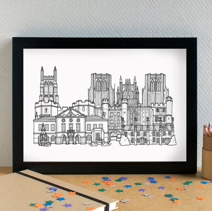 A pretty print of my skyline illustration of the most famous landmarks in Wells, Somerset.