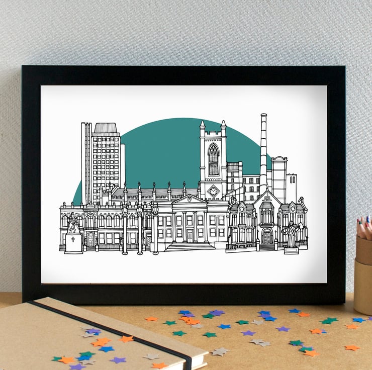 I illustrated this skyline using pen and ink, by hand, and then touched it up digitally to arrive at the final image. It features the Lyceum, the Town Hall (now the Odeon), the Old Library, Royd Mill, the Parish Church, the Civic Centre, the War Memorial, a little statue of Annie Kenney and three little owl sculptures to look over everything.