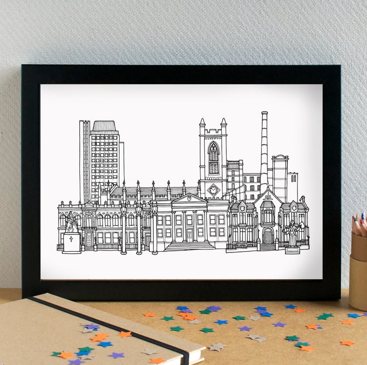 A stunning print of my line-drawn skyline illustration of the most famous landmarks in Oldham, Greater Manchester.