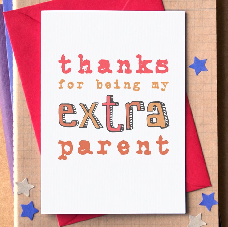 A lovely little card for a step-parent, or perhaps another relative or carer, featuring the phrase "thanks for being my extra parent".