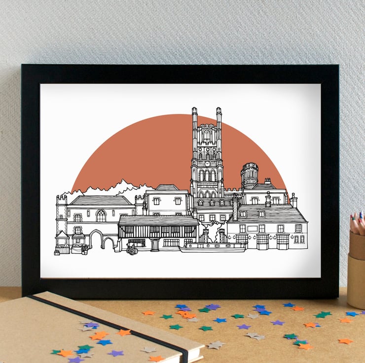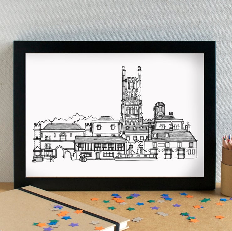 A black and white print of my illustration of the most famous landmarks in Ely, Cambridgeshire.
