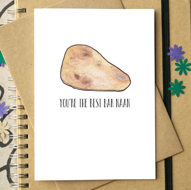 The card features my illustration of a naan bread - which I drew by hand and then coloured with watercolour paint. The phrase "You're the best bar naan" accompanies the image.