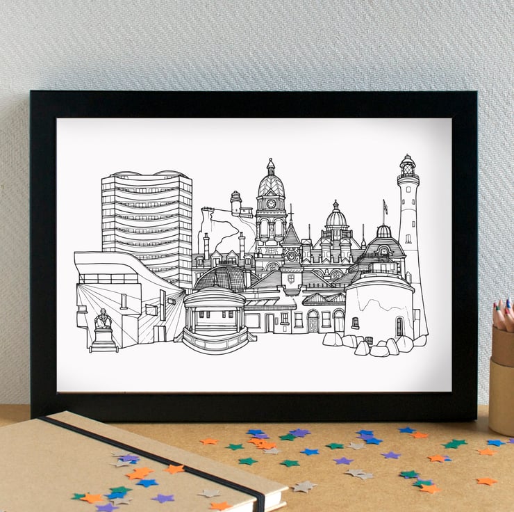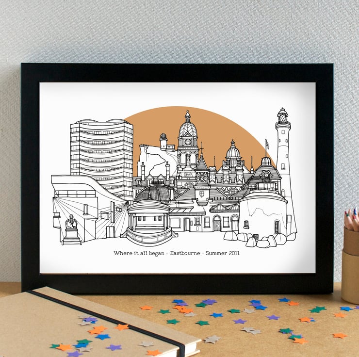 A pretty print of my illustration of the most famous landmarks in Eastbourne.