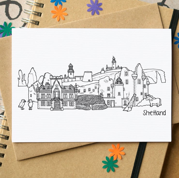 A blank card featuring an illustrated skyline of some of Shetland's most iconic landmarks.