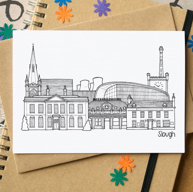 A blank card featuring a skyline illustration of some of Slough's greatest landmarks.