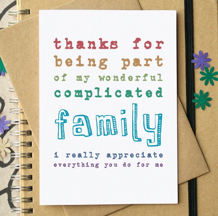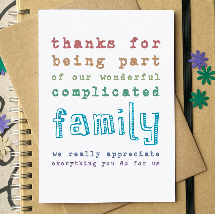 A lovely little card for a step-parent, or perhaps another relative, featuring the phrase "thanks for being part of my wonderful complicated family", and "I really appreciate everything you do for me".