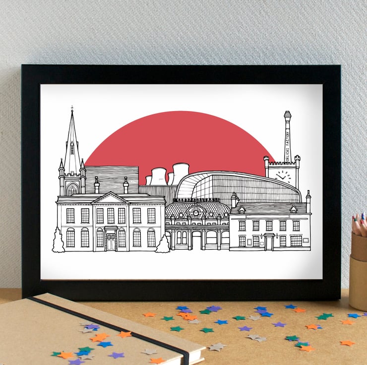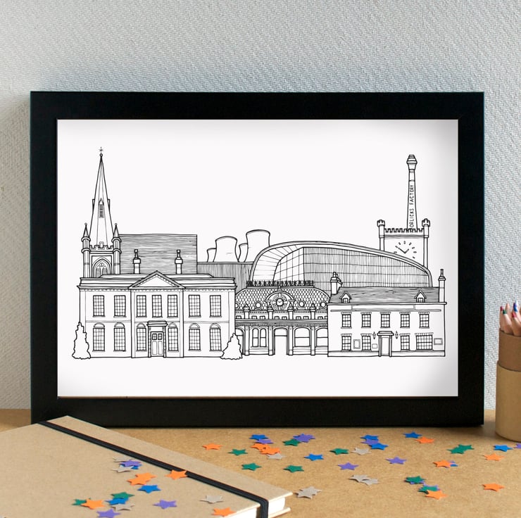A stunning print of my pretty skyline illustration of the most famous landmarks in Slough, Berkshire.