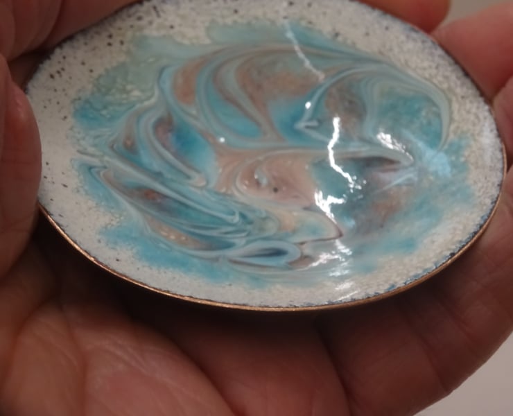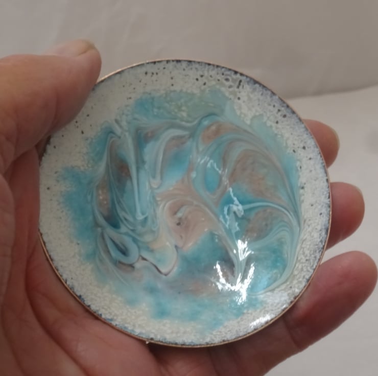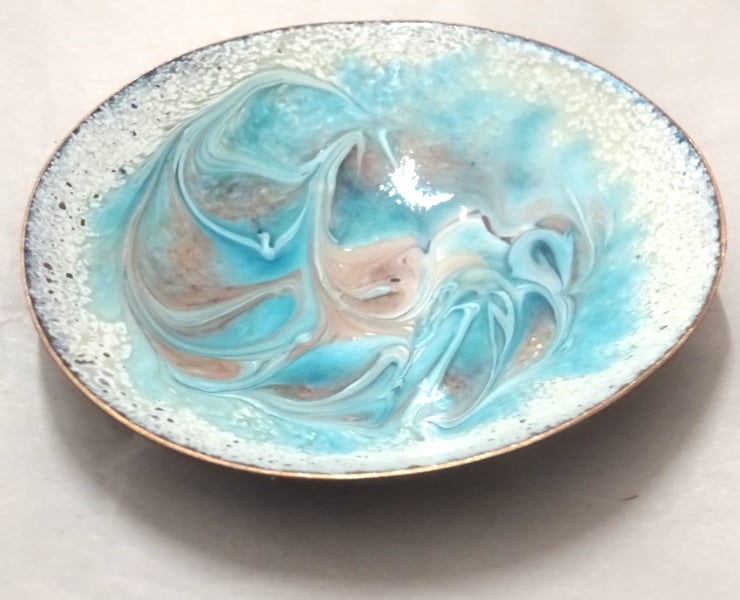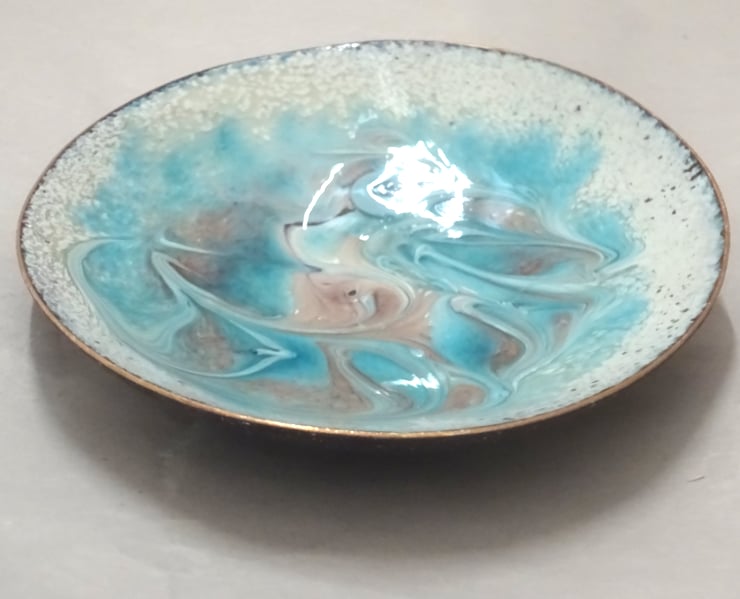 After building a base of clear enamel over the copper bowl I added a layer of white. The speckled effect you see around the rim of the bowl is the copper base showing through the white layer. I then applied scatterings of turquoise and dark pink enamel and created the decoration of the bowl by drawing a steel tip through the molten enamel while it was at red hot, in the kiln.