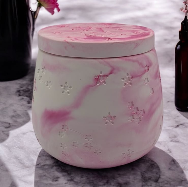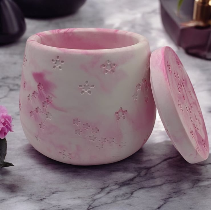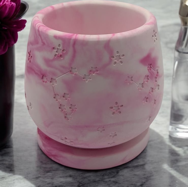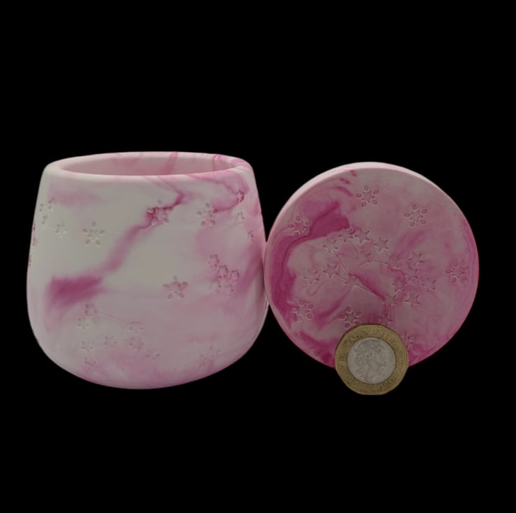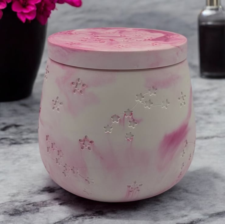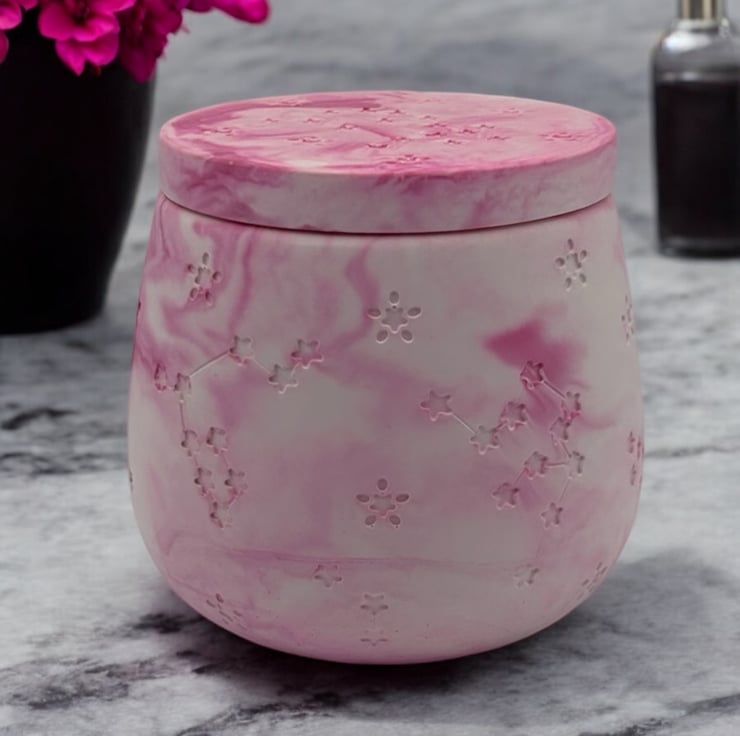 Inspired by the timeless elegance of marble, this star and constellation adorned jewellery box is crafted from a premium British plaster called Crystacast. With a dense, smooth, luxurious finish similar to marble, and a lovely weighty feel. It is perfect for storing your keepsakes, trinkets, jewellery or small treasures. It can also be used as a candle jar to hold tealights or small pillar candles, the lid can then be repurposed as a coaster to protect your surfaces from heat. The beautiful pink marbling effect on this unique trinket pot makes each one a unique piece of art making it an ideal gift for a special person or as a treat for yourself.