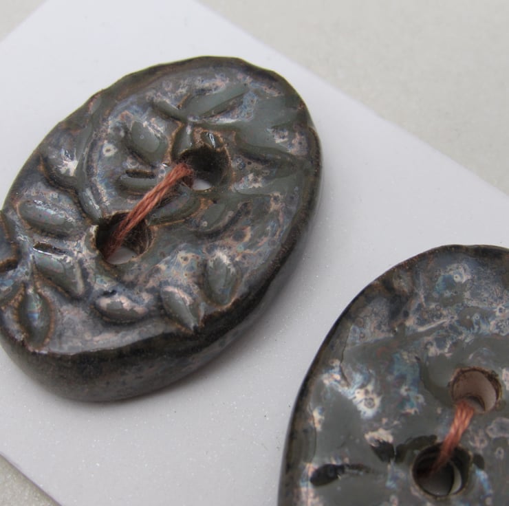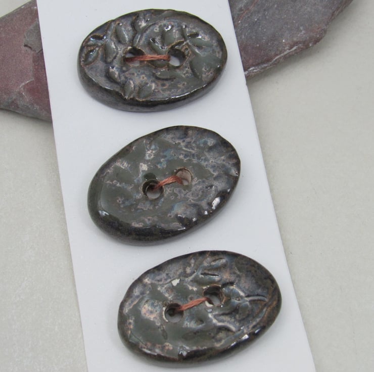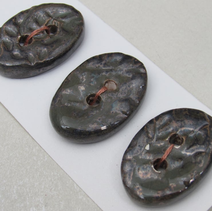 3 medium sized stoneware buttons, with a pretty leaf motif printed into the upper face. Finished with a dark speckled brown glaze.