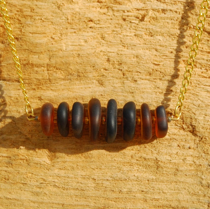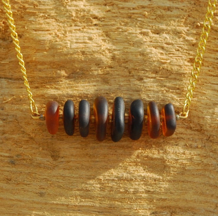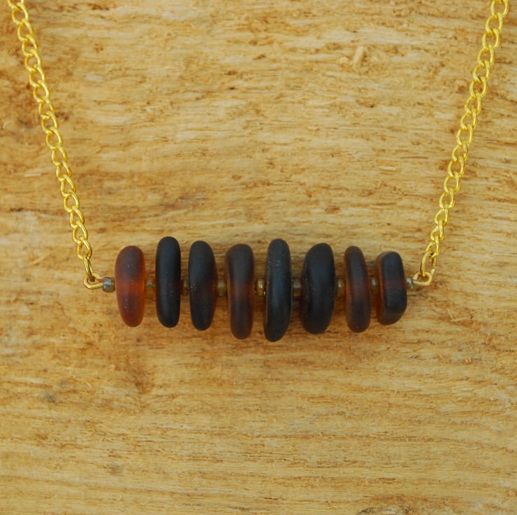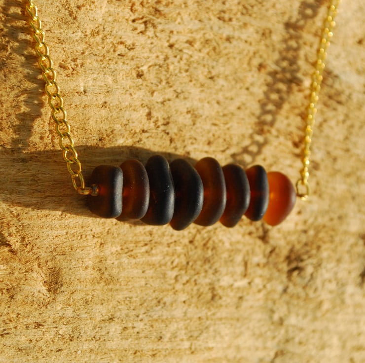 We've created this unusual pendant from eight pieces of tumbled beach glass. The glass has come from old bottles, so there is some variation in the shade of brown. Between the pieces of glass there are small glass beads, and the pendant has been finished with gold plate chain.