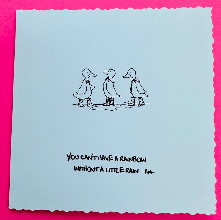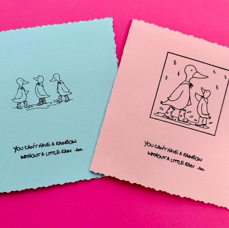A set of 2 cute inspirational duck themed cards with the meaningful quote “you can’t have a rainbow without a little rain” to send to cheer someone up, let them know they have a friend or that you’re thinking of them.