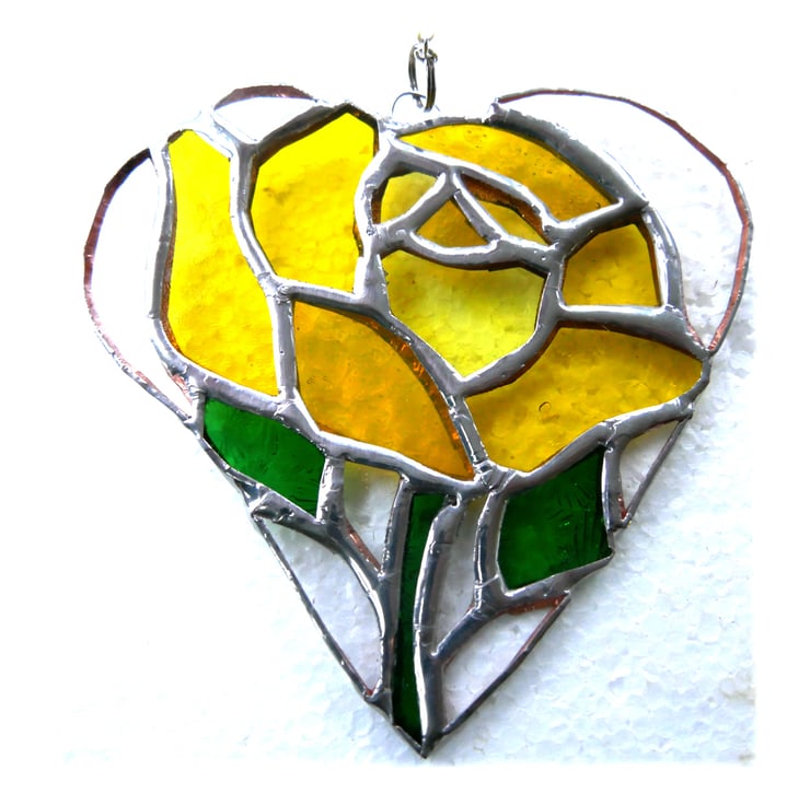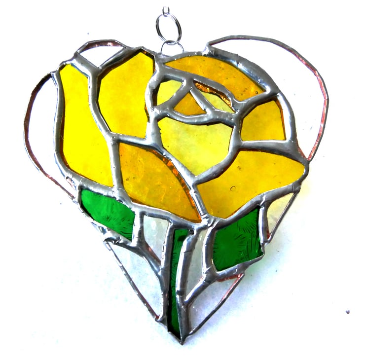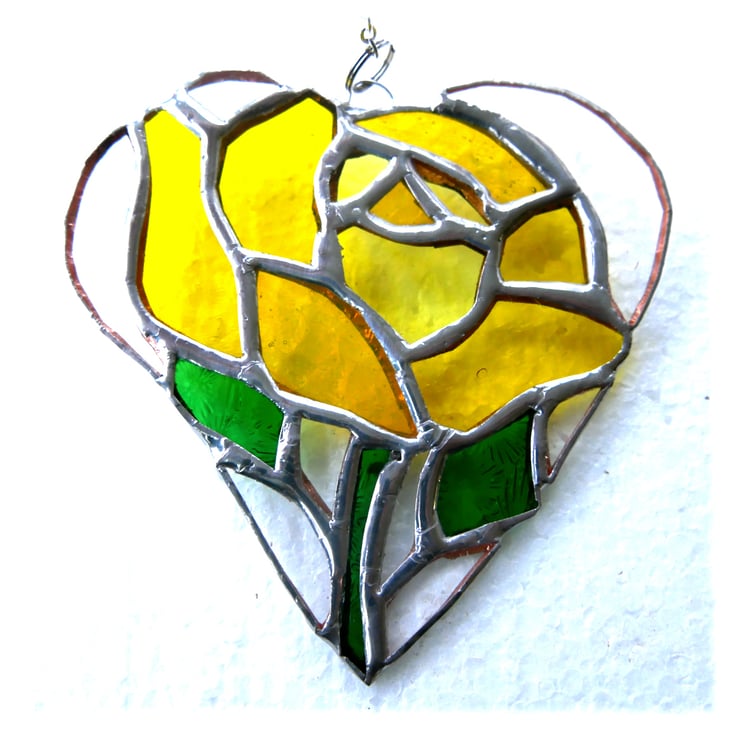 A full bright yellow rose in a heart, entirely handmade by me to my own Joysofglass design.