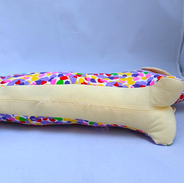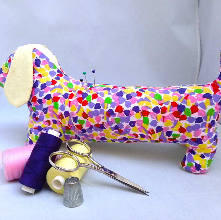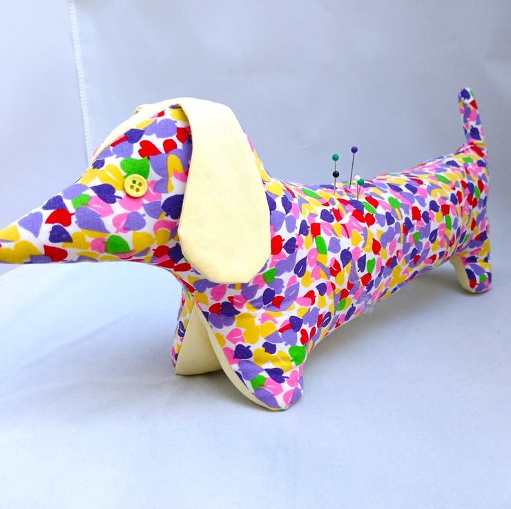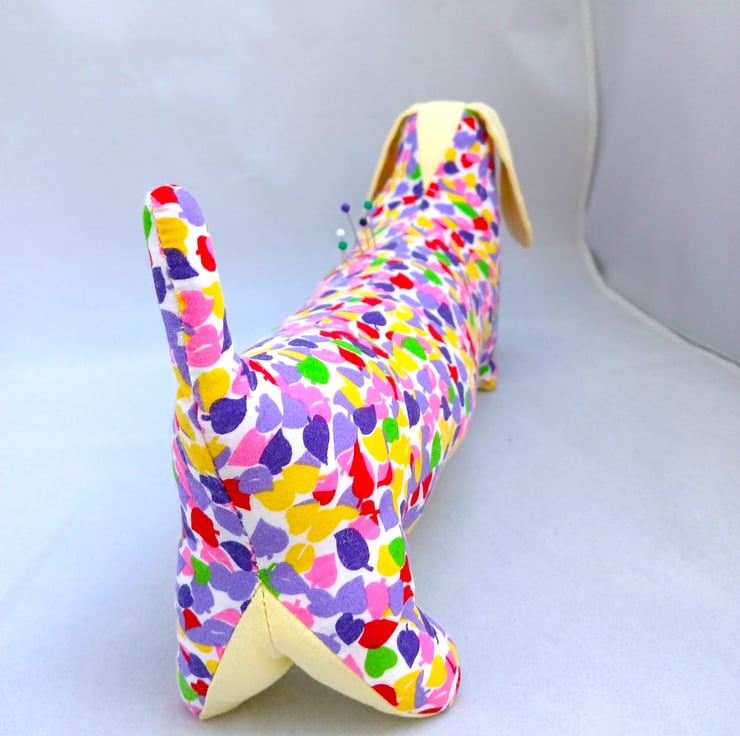 Pin Cushion Sausage Dog in multi colours. Multi colour body with plain yellow ears, under body and head piece.