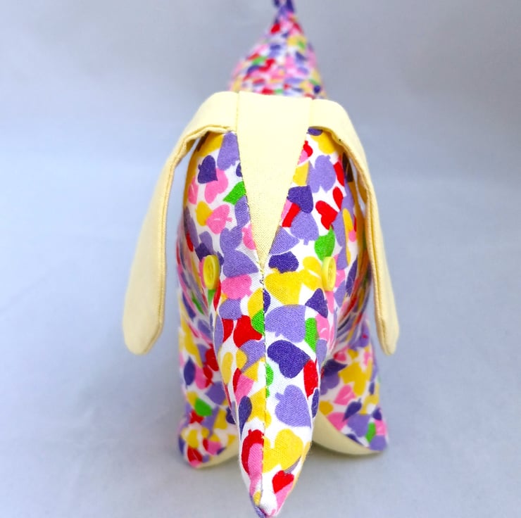 This Dog is made from cotton fabric and is filled with polyester filling. Yellow buttons for the eyes