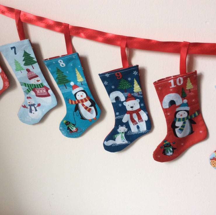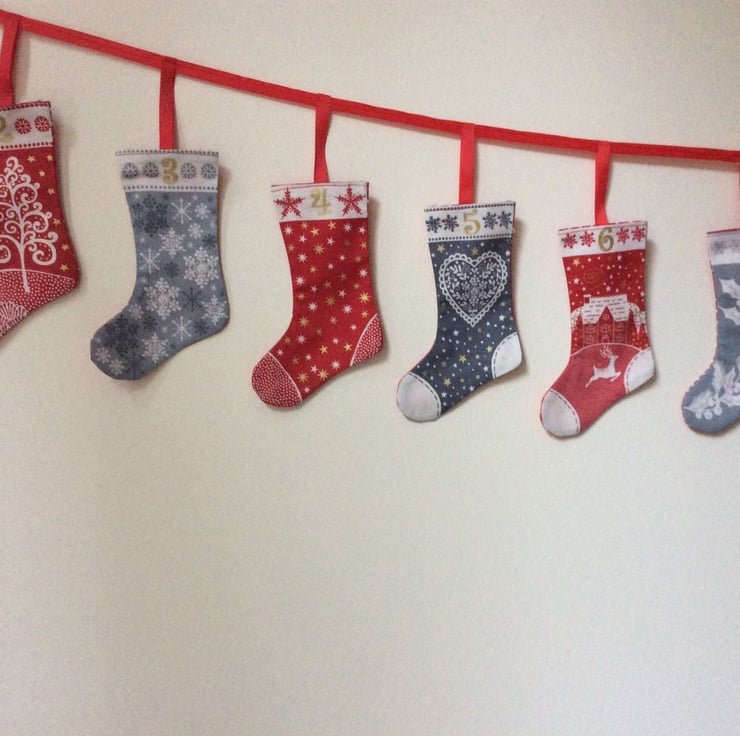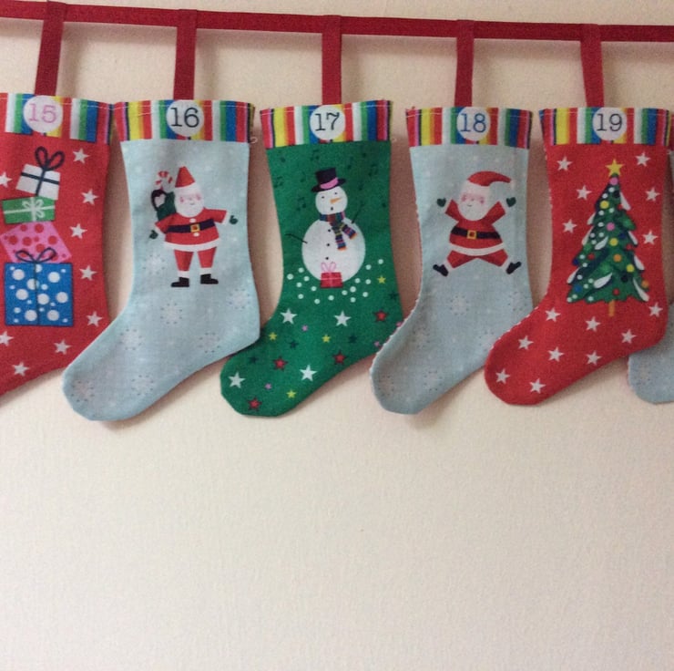 different styles of advent calendar stockings on hanging ribbons to suit all tastes