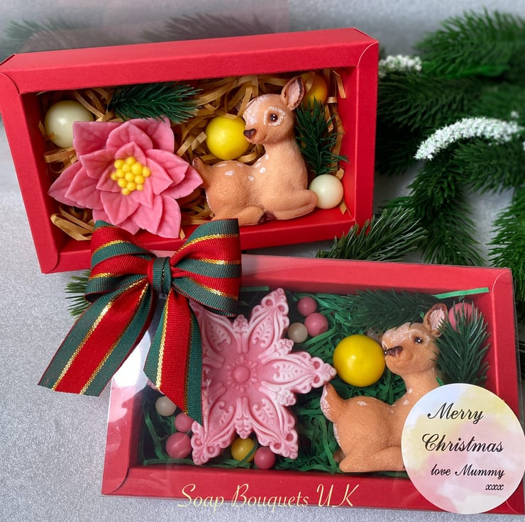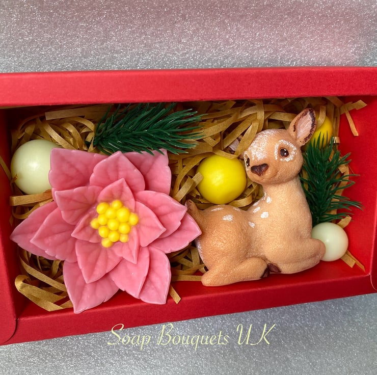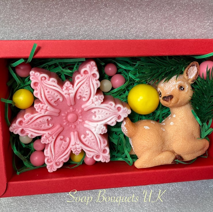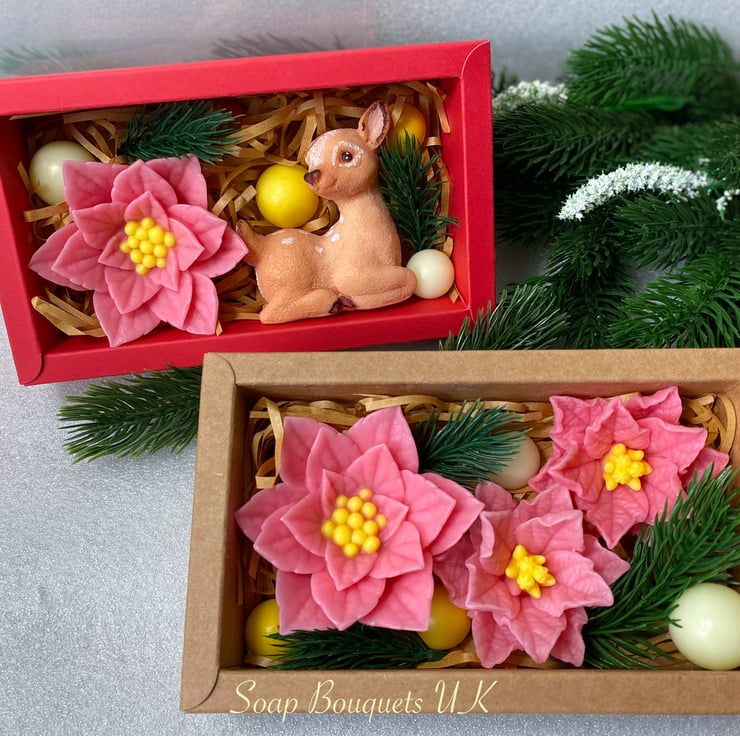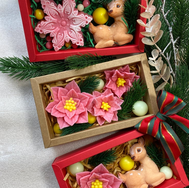 Explore our enchanting selection of handmade vegan soap gift sets, ideal for the festive season! Each set includes delightful designs such as three poinsettia flowers, a whimsical snowflake paired with a reindeer, and a lovely combination of a poinsettia and a reindeer. These gifts are not only visually stunning but also thoughtful holiday presents.