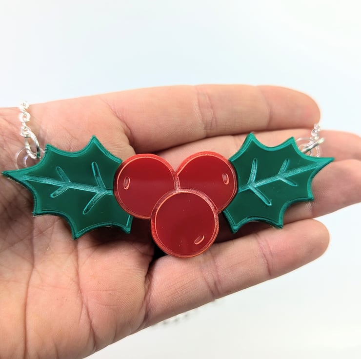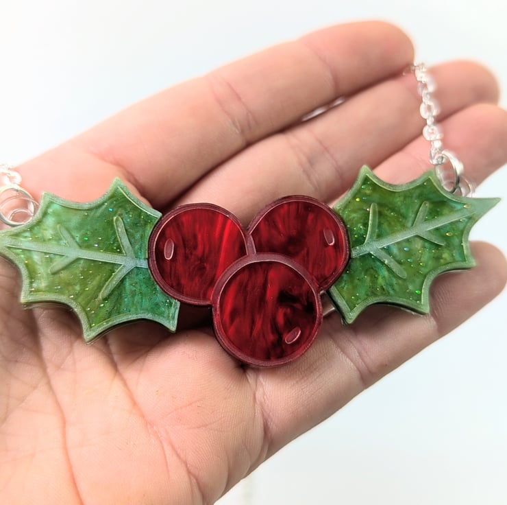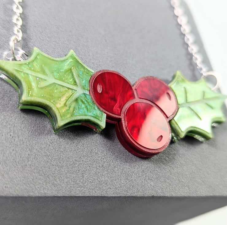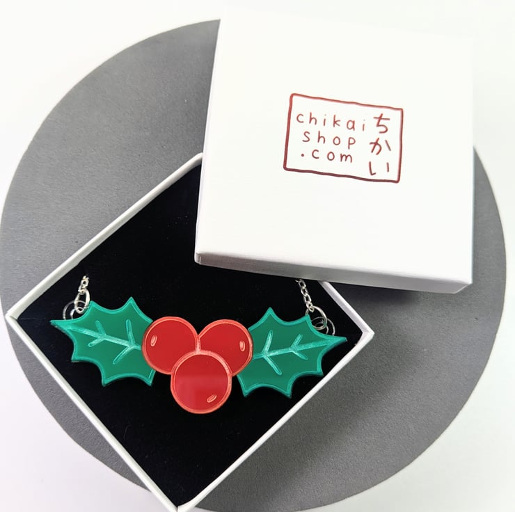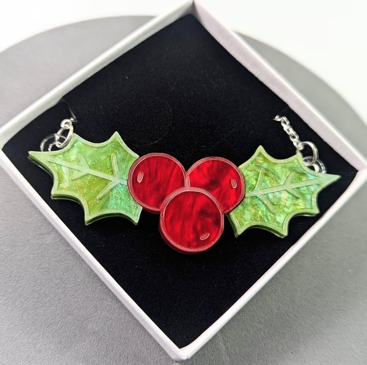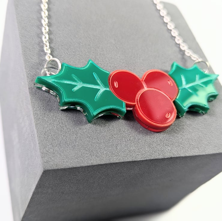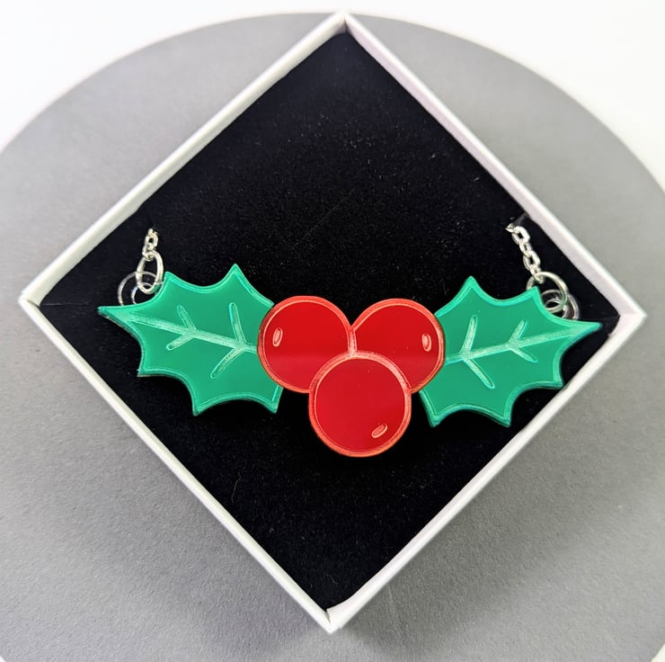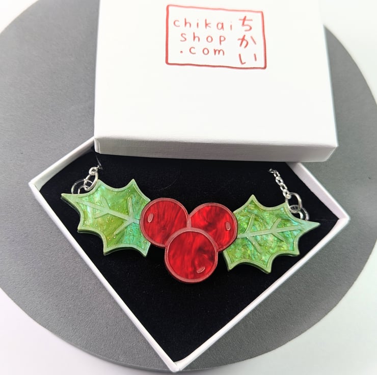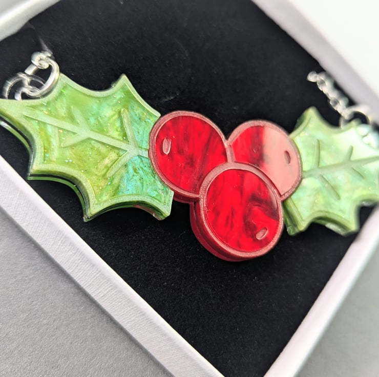 The Holly necklace is made with different pearlescent colours of acrylic (red and green). Each piece includes a branded jewellery box made with FSC certified product.