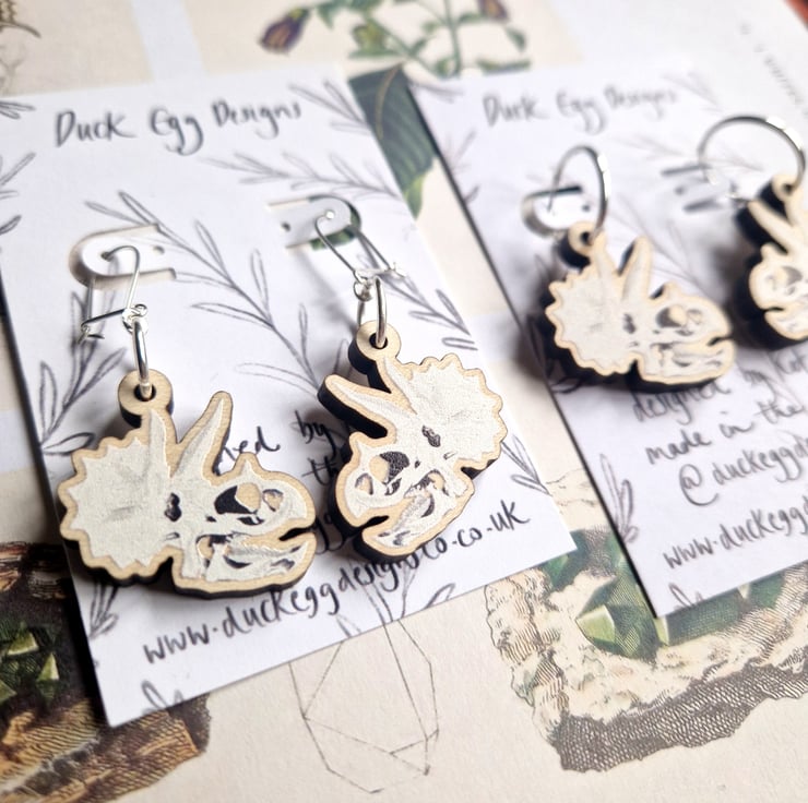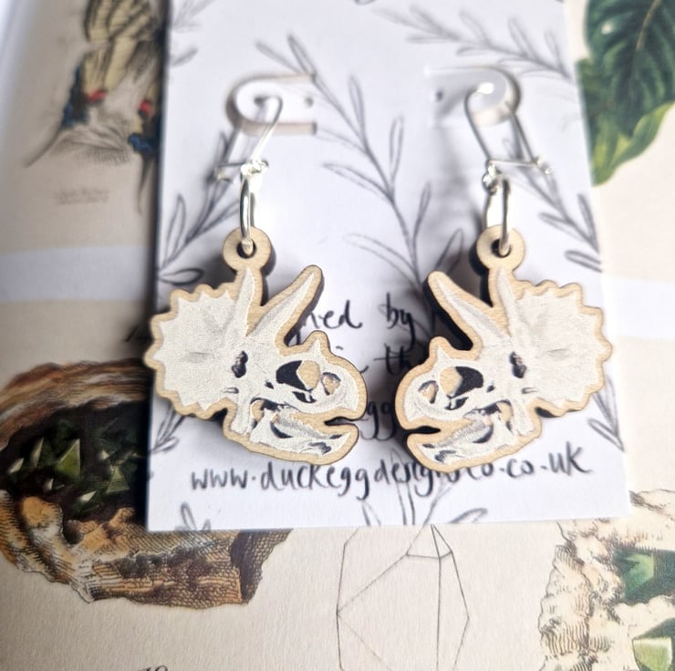 Lightweight triceratops earrings with charms featuring my artwork. The earrings come with sterling silver hooks and the charms are made with sustainable wood.