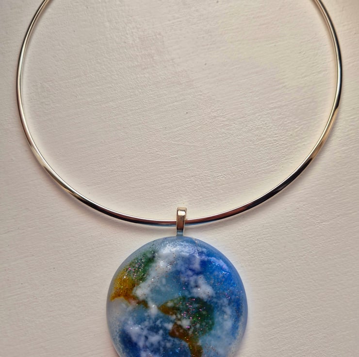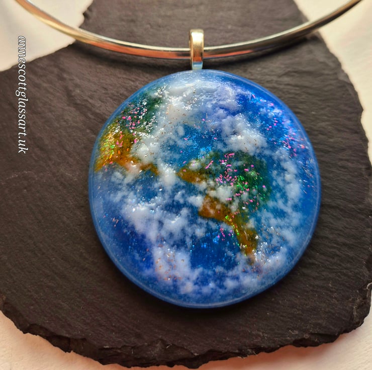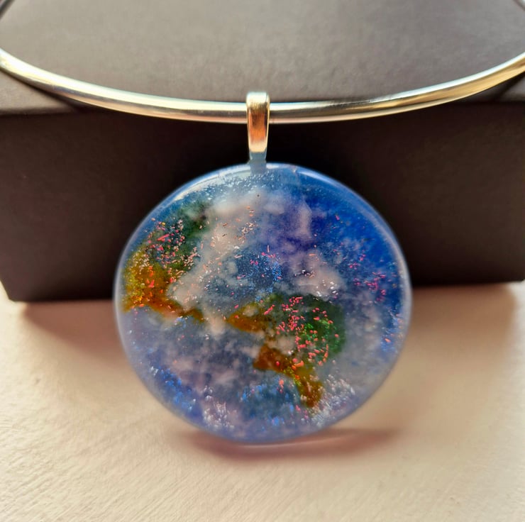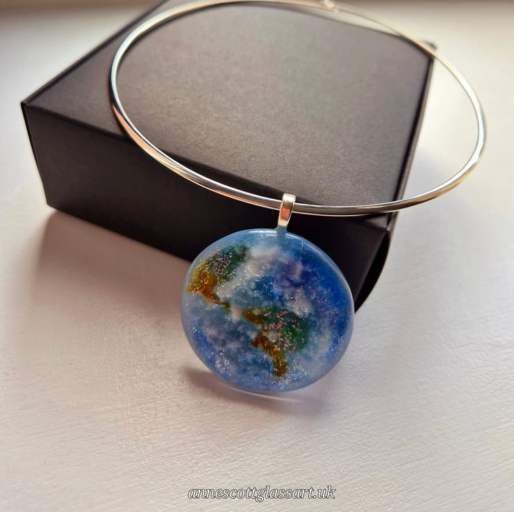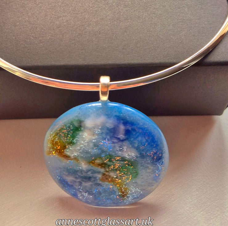 Fused Glass Pendant of the World we live on with 3D cloud details. Finished with dichroic glass to add a bit of sparkle, The pendant is 5cm in diameter by 6mm. on a silver-plated neck-ring The neck-ring is 13cm in diameter and 3mm thick