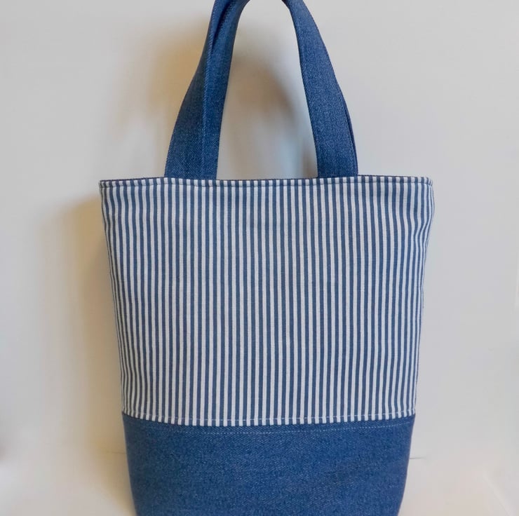 The tote bag has a denim base with a blue and white canvas style fabric above. Both backed with fusible fleece. I used fabric collage to make a cute beach hut and bunting on the front, with the addition of buttons and bunting ribbon. The short denim handles measure about 38cm (with a drop of about 17cm). All neatly top stitched. Inside is faced at the top with denim for a professional finish and then the lower part is lined with bright yellow cotton fabric. There's a key ring loop so that you can clip your keys or the purse inside.