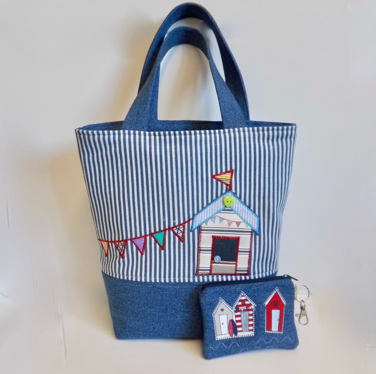 This tote bag and purse set has a fresh seaside feel with it's blue and white stripes and beach hut theme.