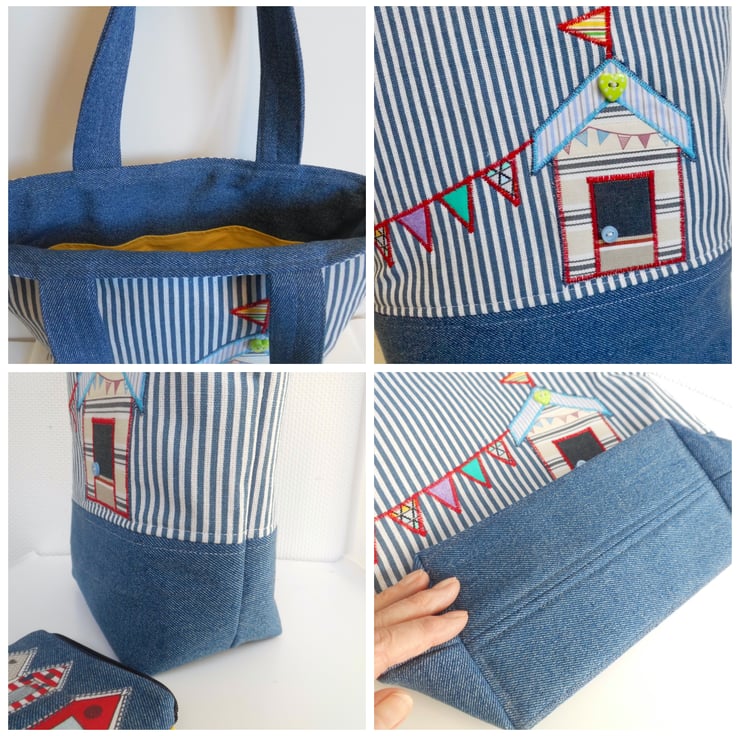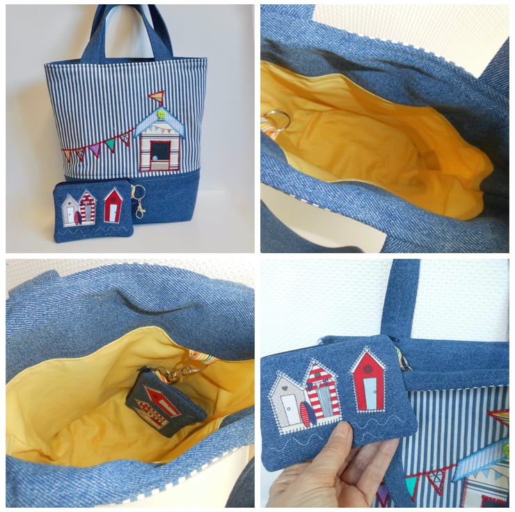 The matching purse measures about 12cm x 9cm and is lightly padded with felt. Made with denim an appliquéd with printed beach huts. Lined with the same yellow cotton as the bag. There is a key ring loop in one side seam and it will clip snugly into the bag using the lobster clip included.