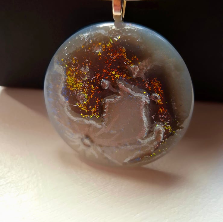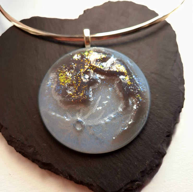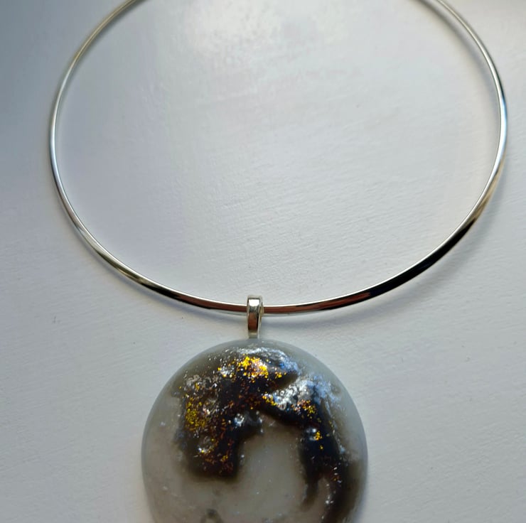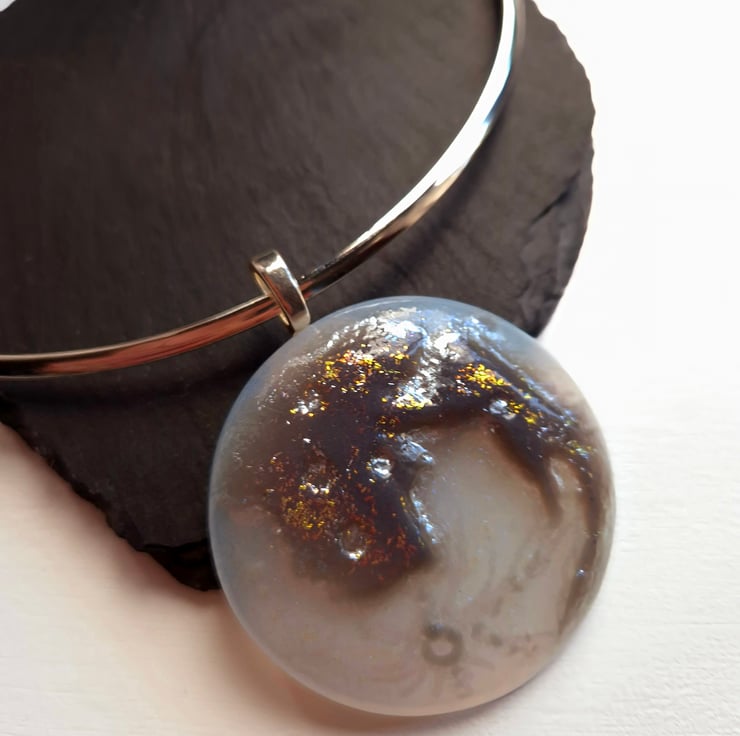 The fused glass pendant is of a full moon with real silver lustre and 3D details of the luna's surface. The glass will glow in the dark for a short time after being exposed to a bright light. Finished with dichroic glass to add a bit of sparkle, The pendant is 5cm in diameter by 6mm. on a silver-plated neck-ring The neck-ring is 13cm in diameter and 3mm thick