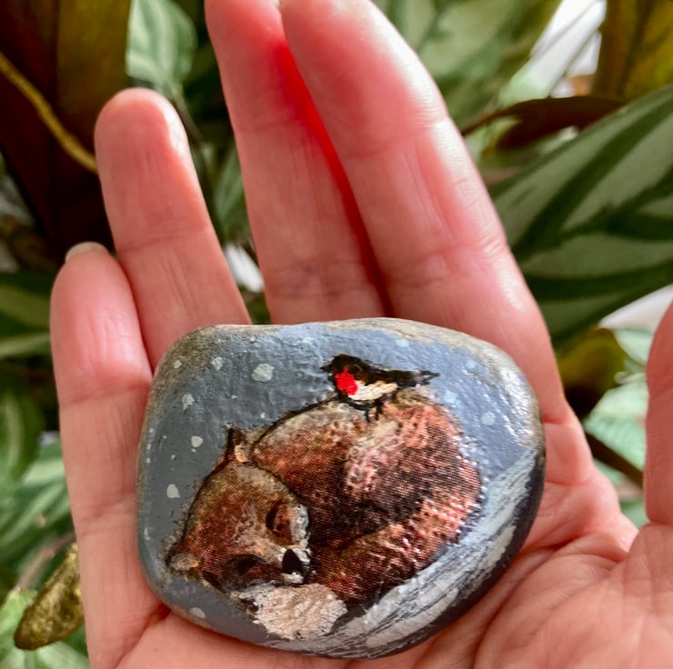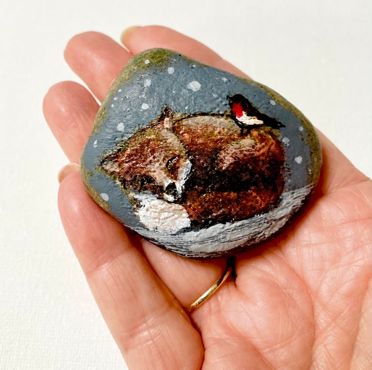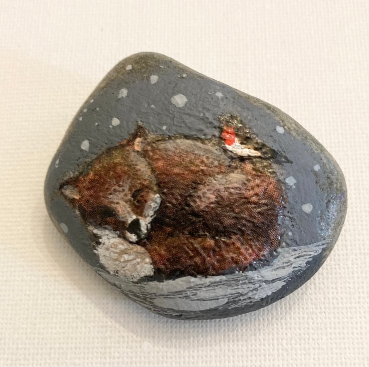 Little Sleepy Fox & Robin Friend Hand Painted and Decoupaged Natural Stone Ornament