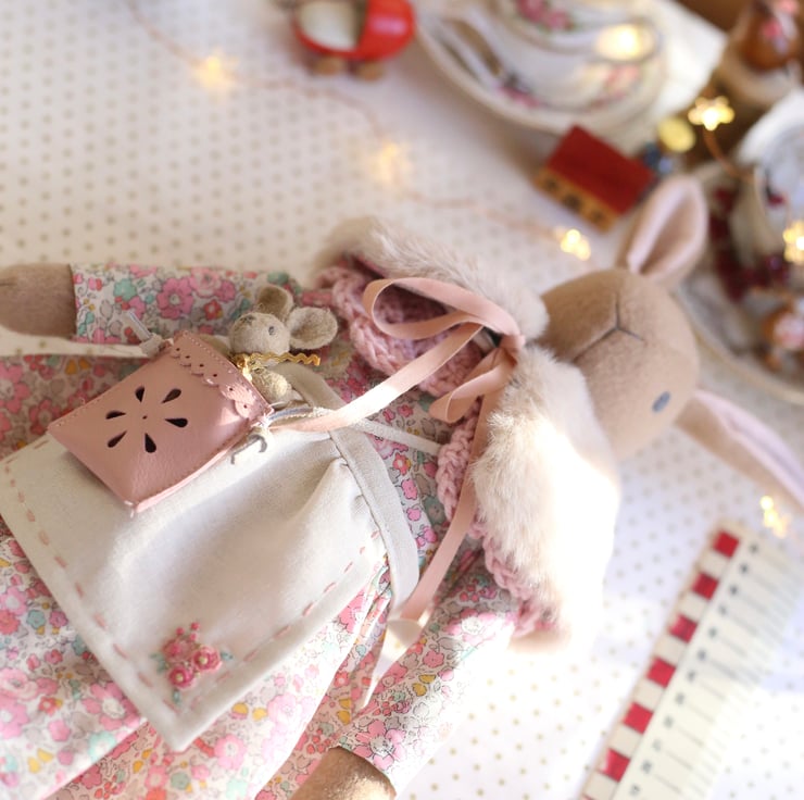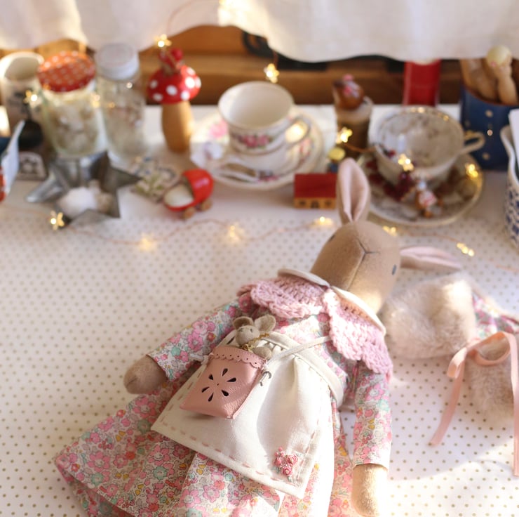 Her accessories include a tiny leather bag, hand punched with a daisy design and containing a baby bunny with a ric rac tie.