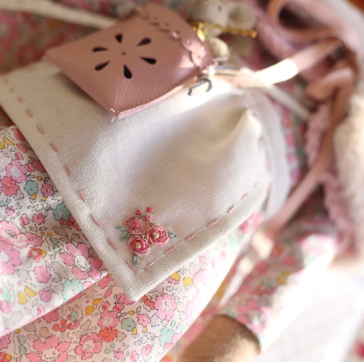 Her apron is made from cotton/linen fabric and embroidered with tiny running stitches and a little sprig of flowers.