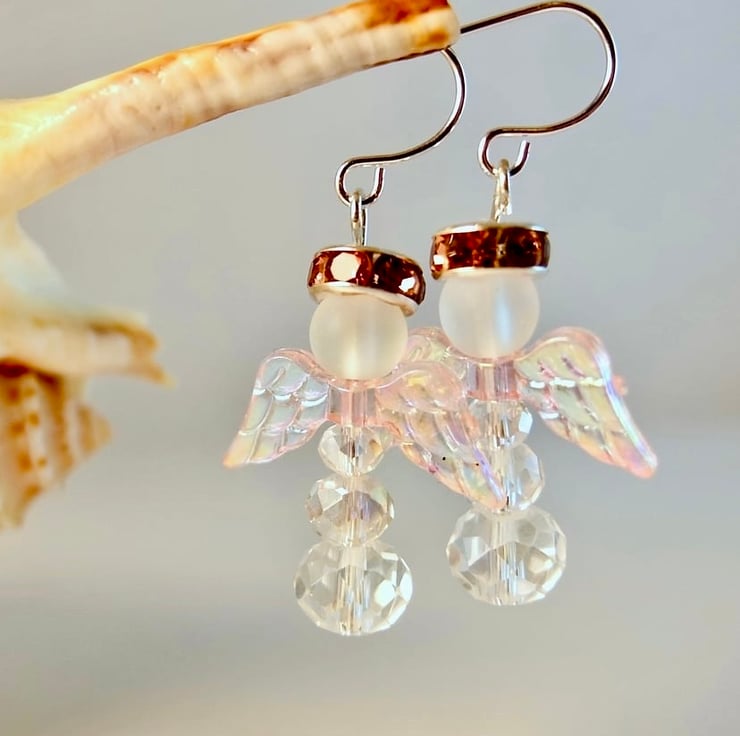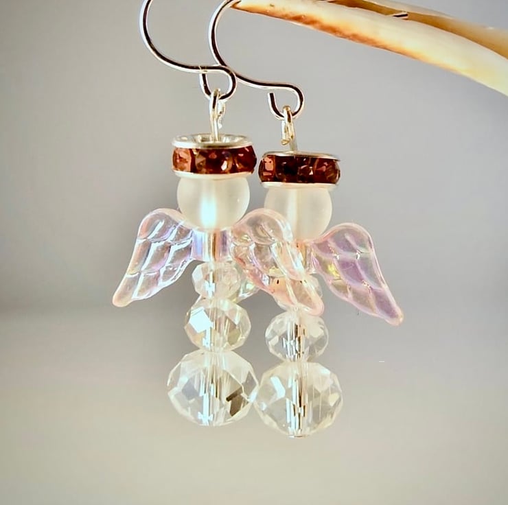 Cute angel earrings made from three sizes of faceted glass rondelles for the body, pale pink, shimmering, translucent acrylic wings, frosted glass round bead for a head and sparkly pink rhinestone halo.