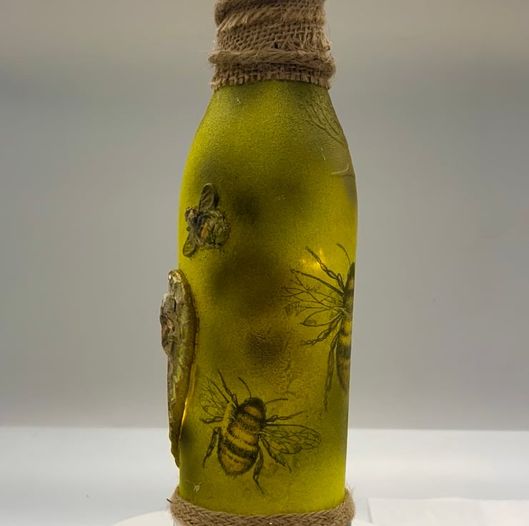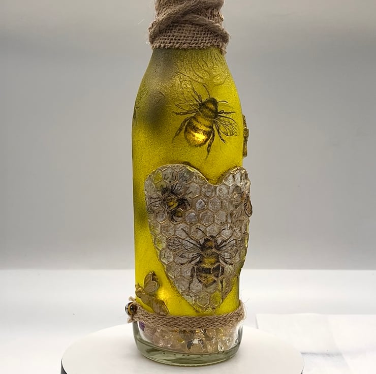 Inside of bottle has battery operated cork string lights which also give off a beautiful effect through the bottle when accompanied by the beautiful decorative crystals at the base of the bottle, finished off with a stylish jute and twine with bee embellishment.