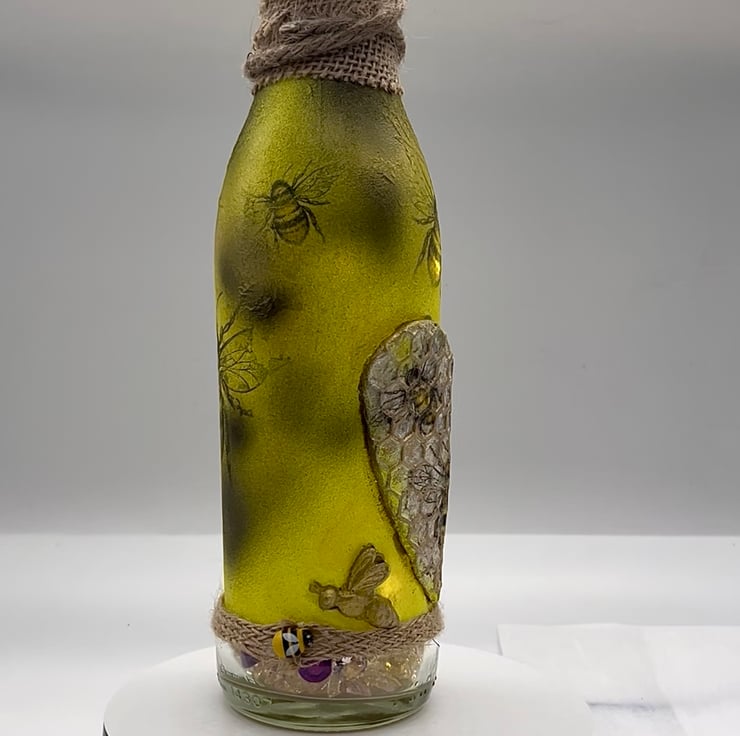 Up cycled fever tree bottle has been air brushed to give a spray paint effect and is surrounded by an adorable handmade clay bee theme.